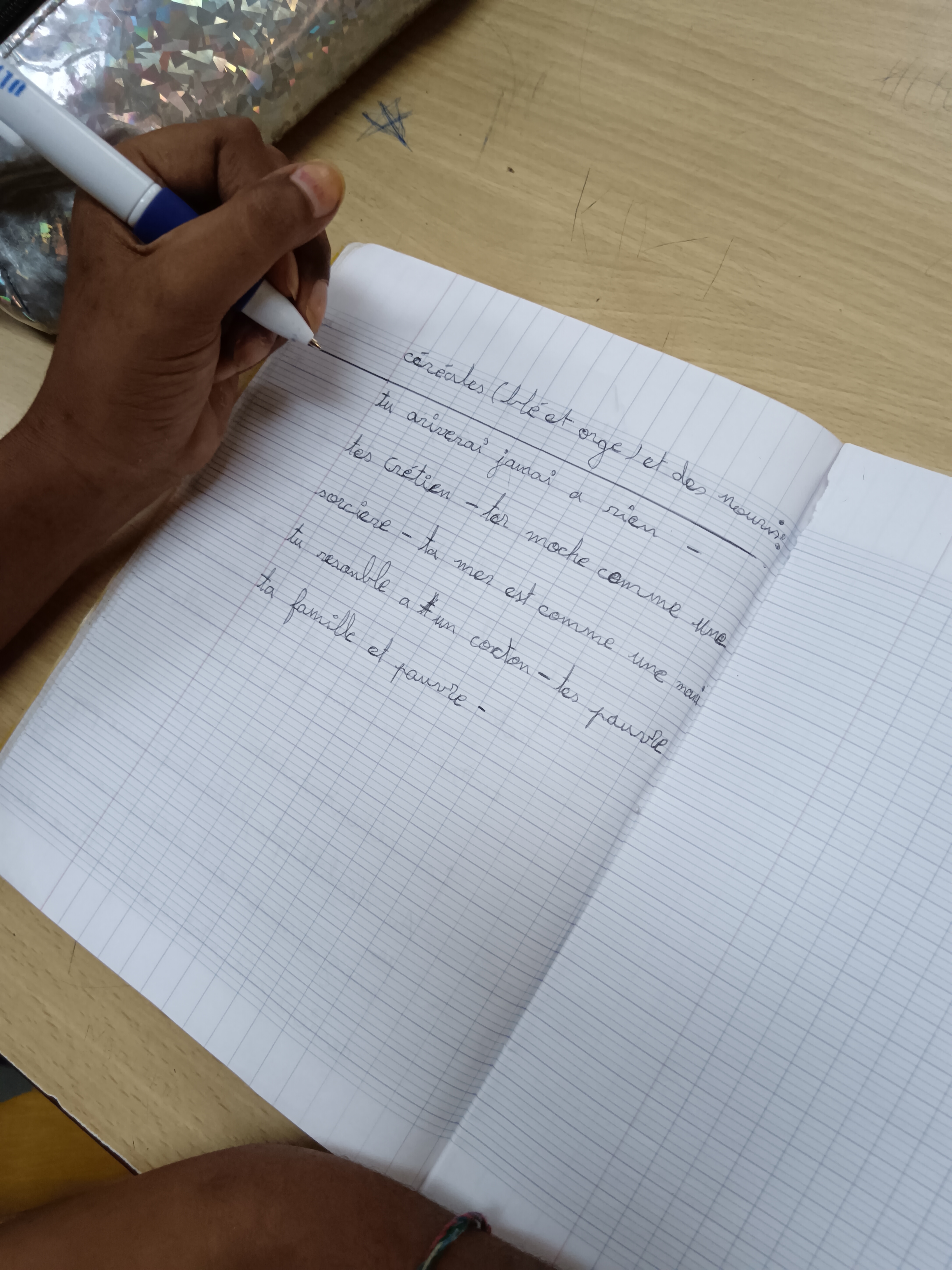 - Une dimension langagière : apprivoiser et valoriser la langue française à travers l’écriture de belles proses, en enrichissant le vocabulaire et en travaillant la syntaxe.